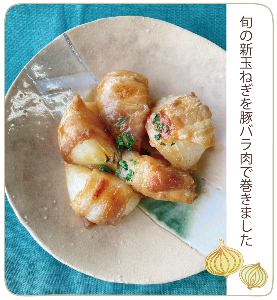 柔らかで甘味のある新玉ねぎを、豚バラ肉を巻いて、甘辛味で焼きました。