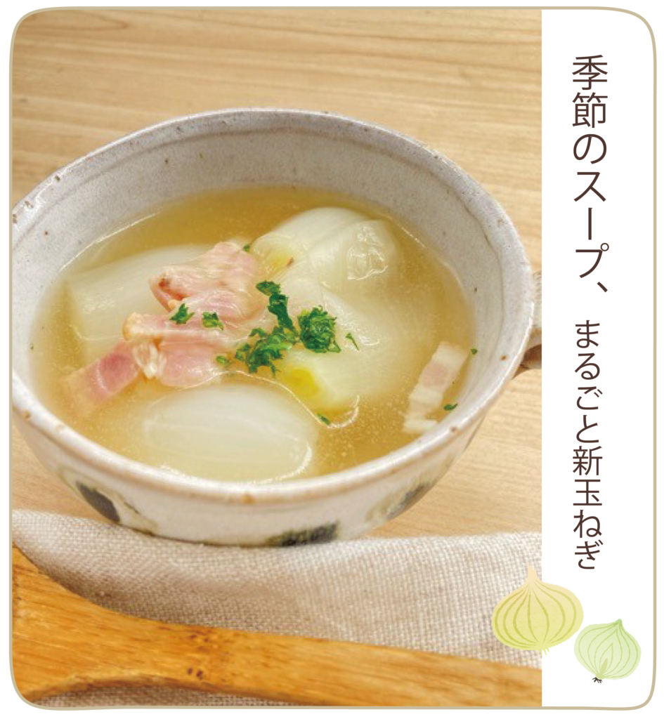 新玉ねぎをまるごと1時間じっくり煮込みました。新玉の甘味とコンソメ風味がスープです。